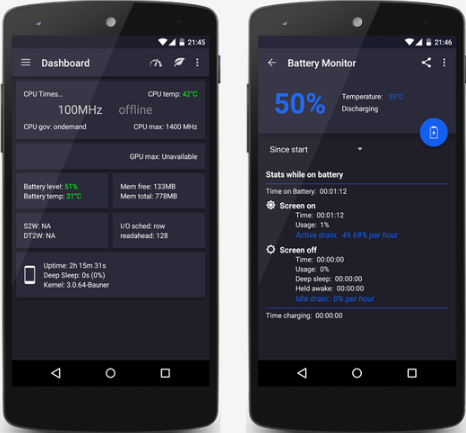 Dashboard: your homepage within the app, Dashboard summarizes your current settings and shows real-time CPU and GPU frequencies, temperatures, memory usage, uptime, deep sleep, battery level and temperature, governors, and i/o settings.