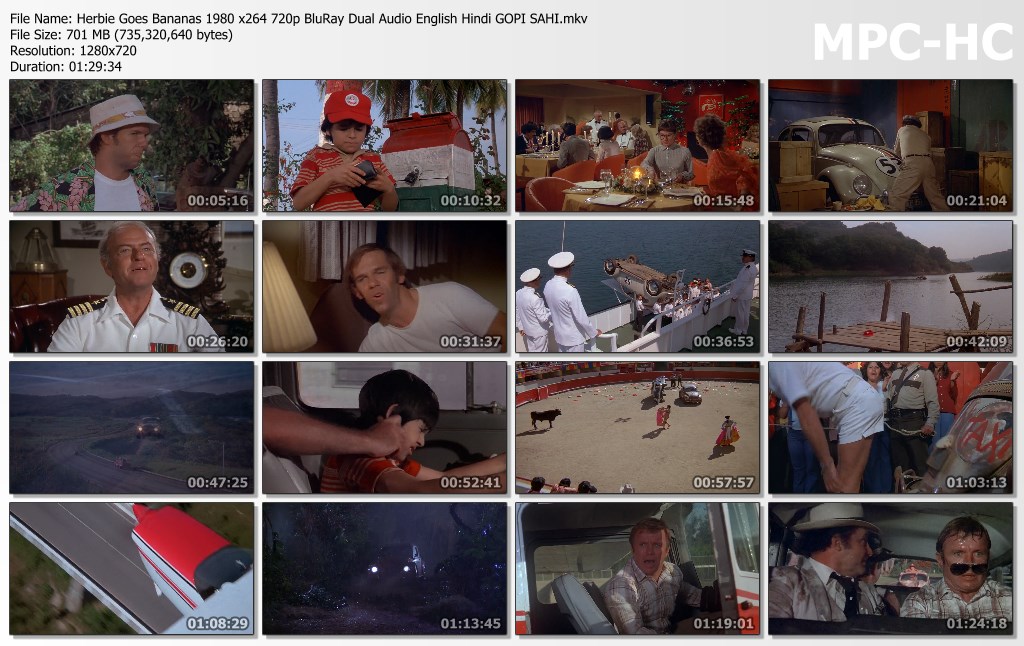 Format : Matroska Format version : Version 4 File size : 701 MiB Duration : 1 h 29 min Overall bit rate : 1 095 kb/s Movie name : Herbie Goes Bananas 1980 GOPISAHI