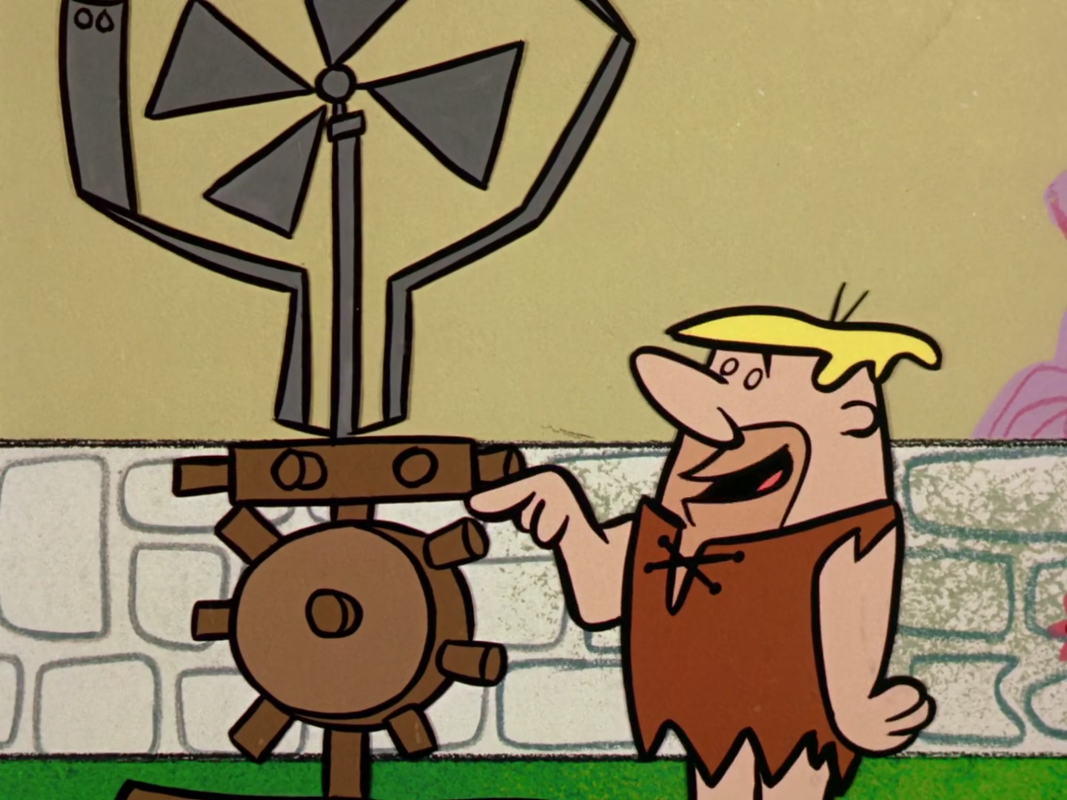 This popular animated television cartoon featured two Stone Age families, the Flintstones and their neighbors, the Rubbles. Much of the humor was based on its comic portrayals of modern conveniences, reinterpreted using Stone Age 'technology.' Most notably were their cars, complete with absence of floorboards to allow them to be 'foot-powered.'